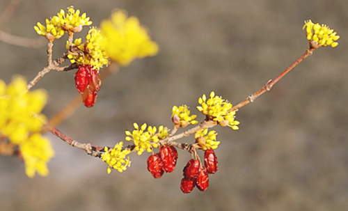산수유의 매력은 산과 계곡 뿐만 아니라 시골의 모습과도 잘 어울린다. 비인기 있는 시골 길가에 한그루의 산수유가 자리해 있으면 시간이 멈추는 것 같은 아늑한 분위기가 감돌 것이다. 소박하지만 아름다운 시골 풍경과 산수유의 만남은 오랜 세월 동안 전해져 내려오는 자연의 향기가 느껴진다. 이는 도시에서 느끼기 힘든 평온함과 고요함을 느끼게 해준다.